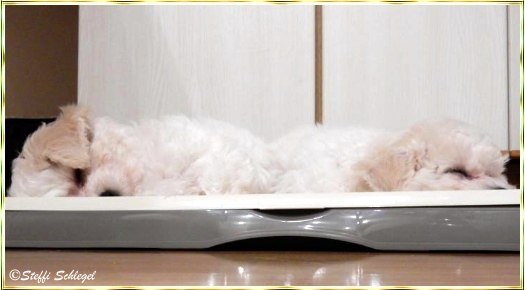 wie schön wir auf unserer neuen Welpentoilette schlummern können